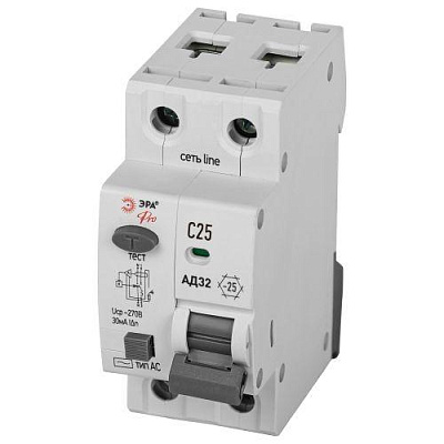 Выключатель автоматический дифференциального тока 1P+N C 25А 30мА тип AC защита 230В АВДТ 4.5кА PRO D32E2C25AC30P АД32 электронное Эра Б0057352