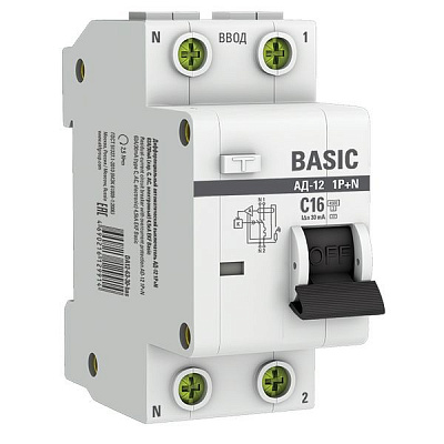 Выключатель автоматический дифференциального тока 2п (1P+N) C 16А 30мА тип AC 4.5кА АД-12 Basic EKF DA12-16-30-bas