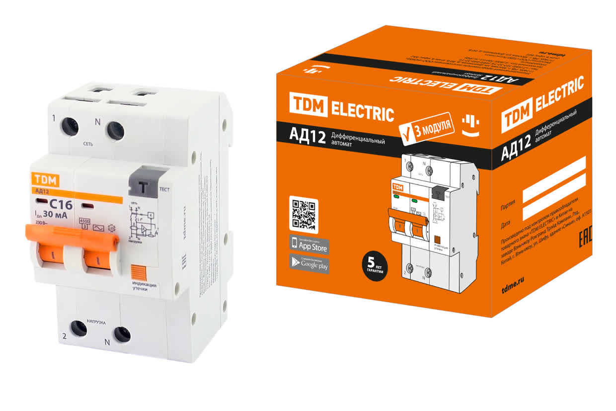 Выключатель дифференциального тока автоматический АД12 2P 16A C 30mA 4,5kA TDM SQ0204-0106 |