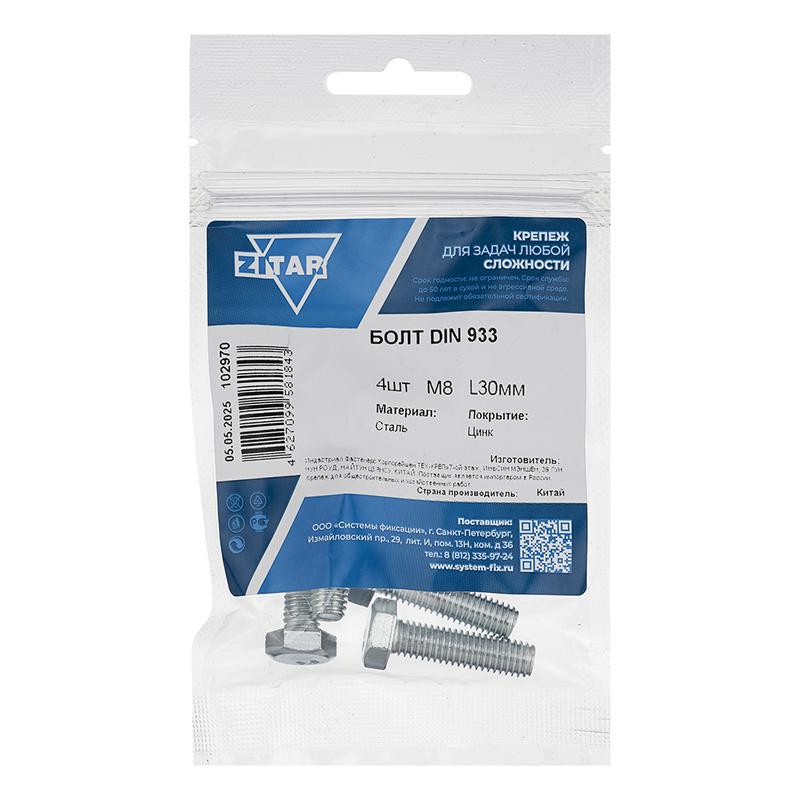 Болт с шестигранной головкой М8х30 DIN 933 класс прочн. 8.8 оцинк. (пакет) (уп.4шт) Tech-Krep/Zitar 102970