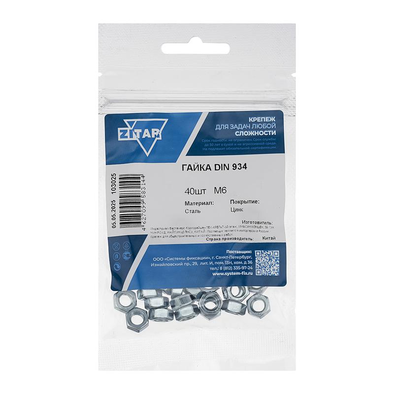 Гайка шестигранная М6 DIN 934 цинк. (пакет) (уп.40шт) Tech-Krep/Zitar 103025