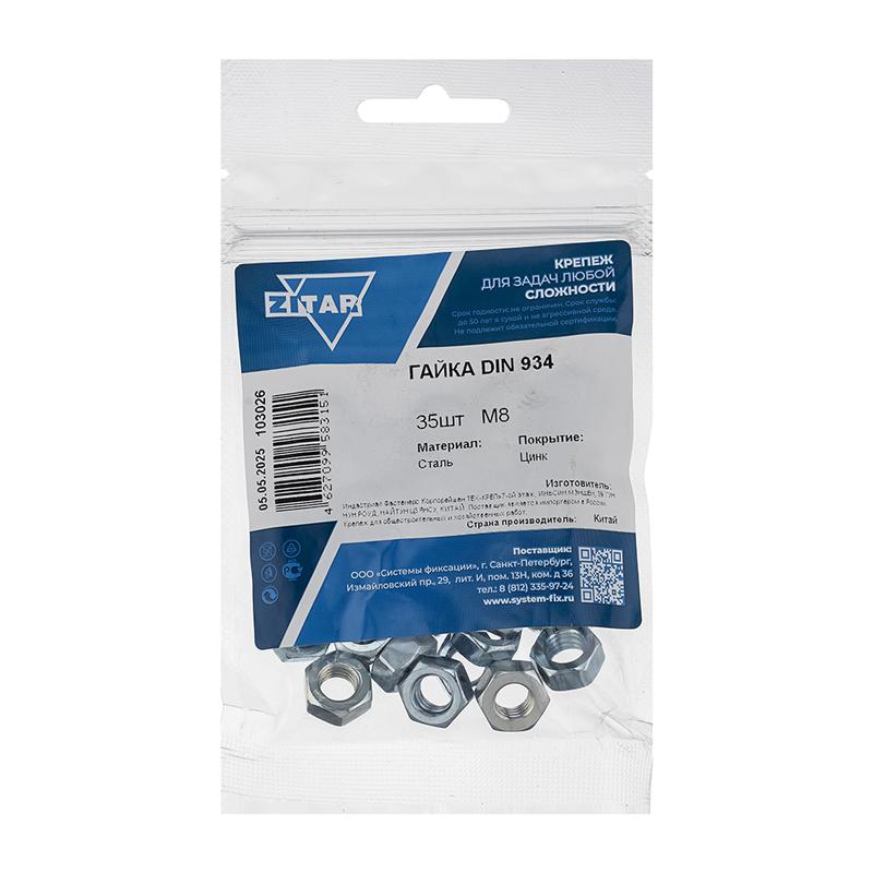 Гайка шестигранная М8 DIN934 цинк. (пакет) (уп.35шт) Tech-Krep/Zitar 103026