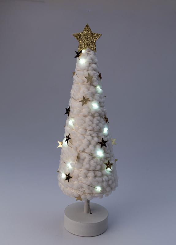 Настольный светильник "ЕЛОЧКА" KOC_TAB-B105. Коллекция настольных елочек Космос - это не традиционные новогоднии деревья, а модное украшение и настольный светильник. Высота 38см и 11см в диаметре. Как легкое белое облачко сияет 20 светодиодами теплого белого света, которые отражаются в дополнительном золотистом декоре в виде маленьких звездочек. Плюшевая елочка на белом деревянном основании и звездой на макушке украсить собой новогодний стол, любую полочку или подоконнник, вернет в детство, где повсюду были напоминания о любимом празднике. Работает от батареек АА