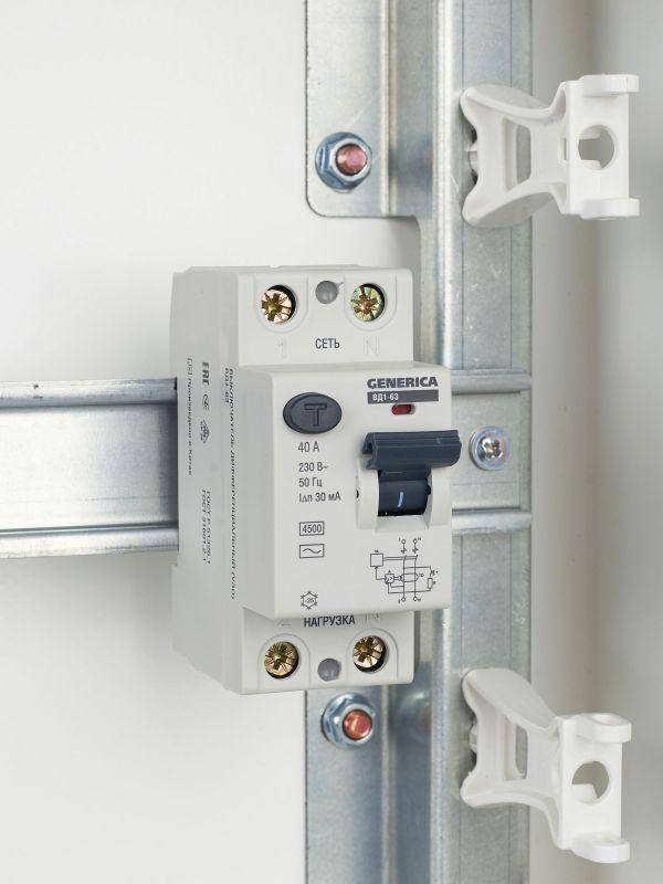 Быстродействующий защитный выключатель ВД1-63 (УЗО) GENERICA - устройство электронного типа, зависящее от напряжения и реагирующее на дифференциальный ток, без встроенной защиты от сверхтоков. Предназначен для защиты человека от поражения электрическим током.