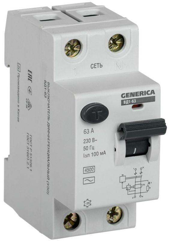 Выключатель дифференциального тока (УЗО) 2п 63А 100мА тип AC ВД1-63 GENERICA MDV15-2-063-100